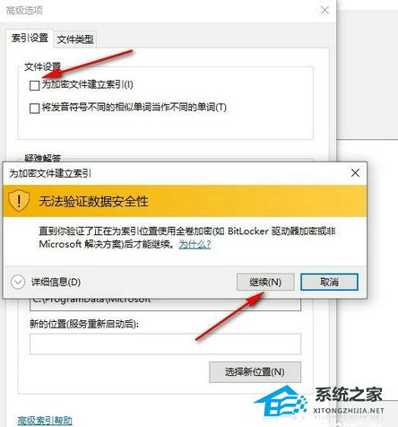 4. 进入“高级选项”页面之后,勾选“为加密文件建立索引”选项,在弹框中点击“继续”选项。