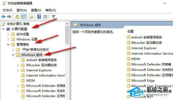 2. 进入本地组策略编辑器页面之后,先打开计算机配置、管理模板和“Windows组件”选项。