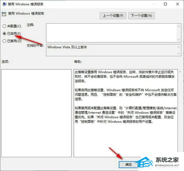 5. 在禁用Windows错误报告的弹框中点击“已启用”选项,再点击“应用”和“确定”选项即可。