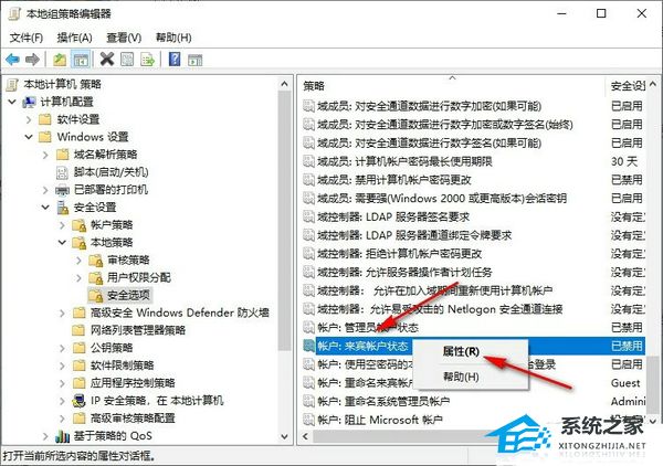 4. 在安全选项的右侧页面中,找到“来宾账户状态”选项,右键单击该选项并选择“属性”选项。