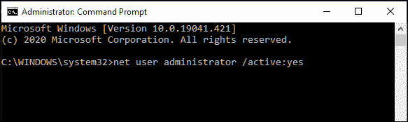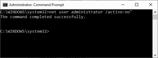 要再次禁用它,请返回命令提示符并键入“netuseradministrator/active:no”。