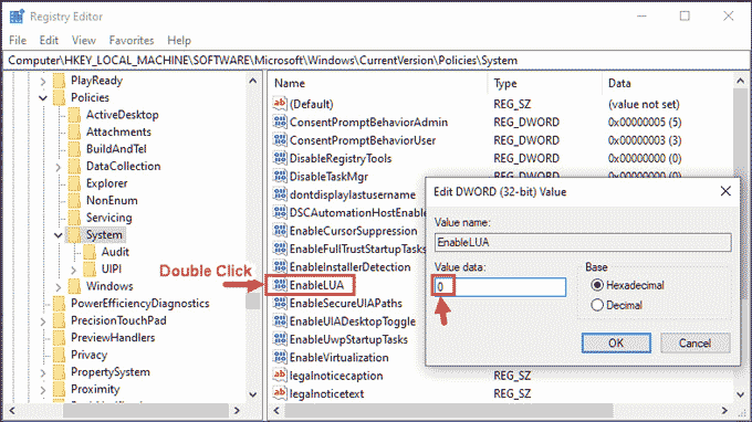 4、然后,找到并双击Key–EnableLUA并将其Value数据更改为0。