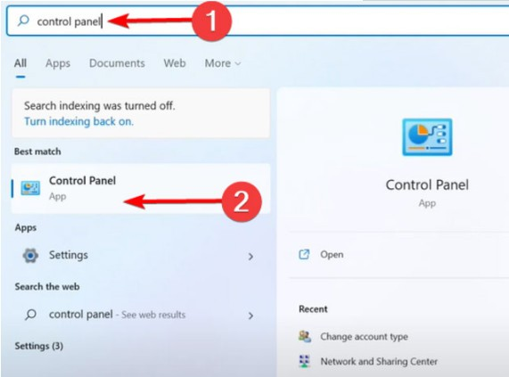 单击“开始”按钮,键入“控制面板”,然后单击它