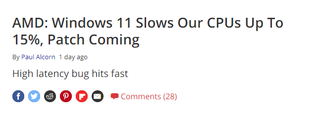 然而,根据各家媒体的实际测试来看,用户在Windows 10和Windows 11下的日常使用性能和游戏体验几乎完全没有区别。不仅如此,最新报告显示Windows 11可能会导致AMD Ryzen处理器三级缓存延迟加倍,其自带的安全功能甚至可能会导致游戏帧数降低近30%。