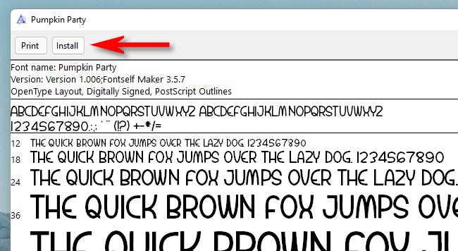 Windows 将在特殊字体预览窗口中打开字体示例。单击“安装”以安装字体。这将自动将字体文件移动到您的 Windows 系统字体文件夹(C:WindowsFonts默认情况下)。