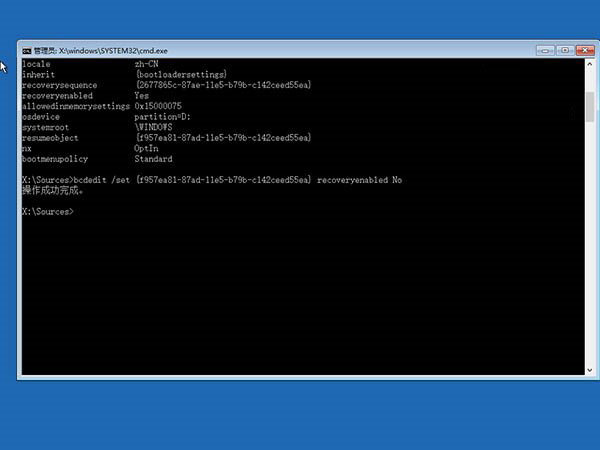 ▲接着输入bcdedit /set {GUID} recoveryenabled No回车运行,运行该命令后就会暂时禁用系统的自动启动修复功能,其中的{GUID}即为上一步中记录的字符。