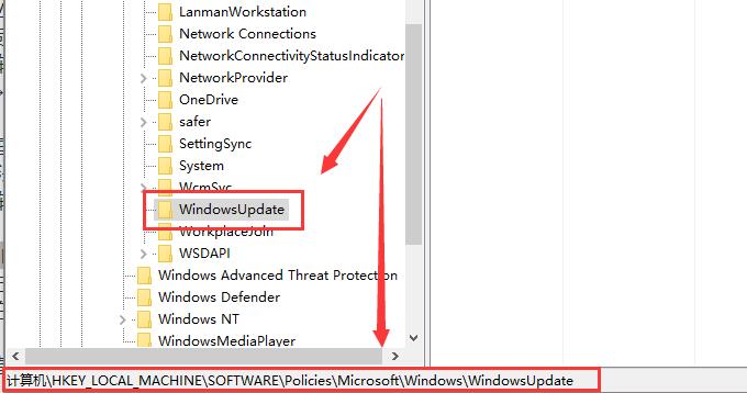 2、然后在注册表中依次展开文件夹:【HKEY_LOCAL_MACHINE\SOFTWARE\Policies\Microsoft\Windows\WindowsUpdate】。