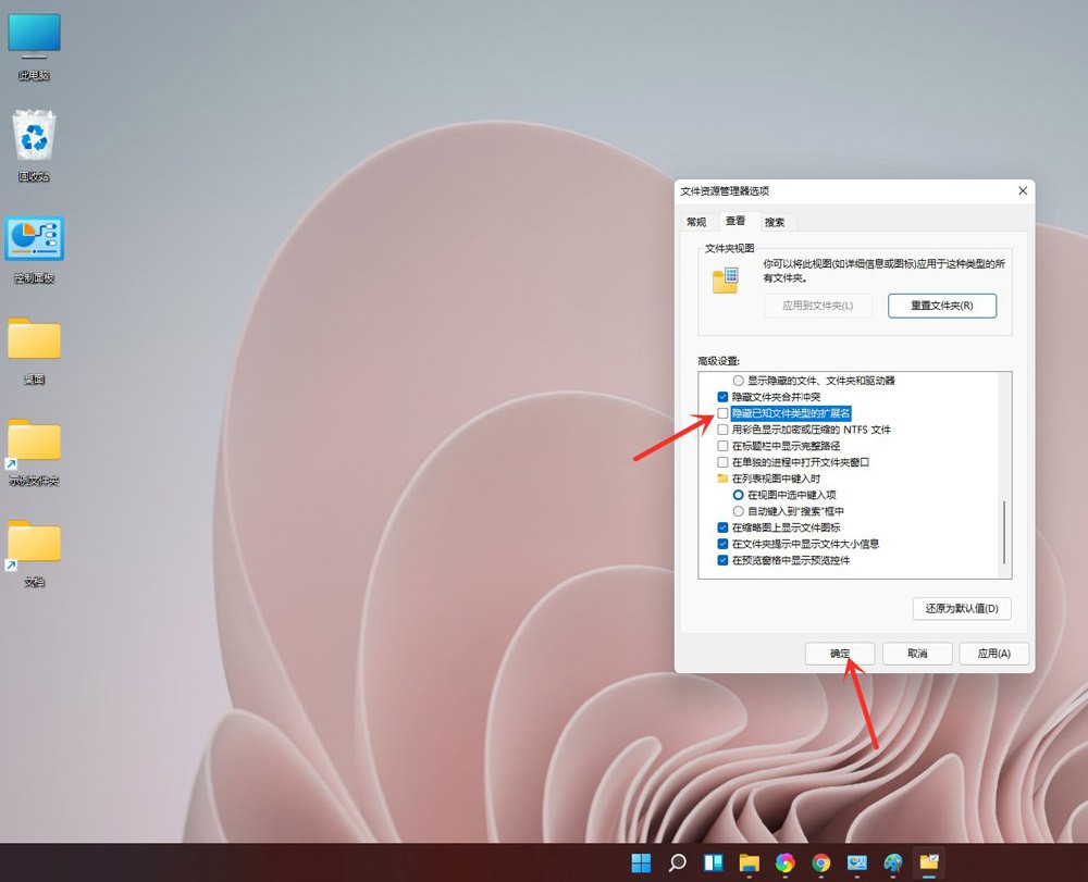 2、在打开窗口的【查看】选项卡中找到【隐藏已知文件类型的扩展名】并且取消勾选,再点击【确定】即可