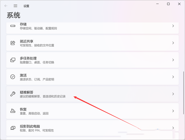 2、系统设置窗口,点击【疑难解答(建议的疑难解答、首选项和历史记录)】;