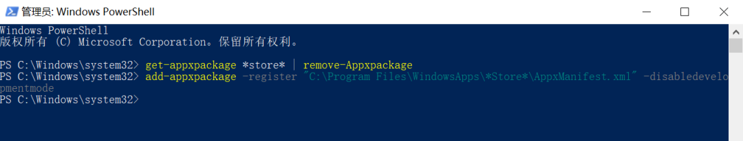 【add-appxpackage -register “C:\Program Files\WindowsApps\*Store*\AppxManifest.xml” -disabledevelopmentmode】