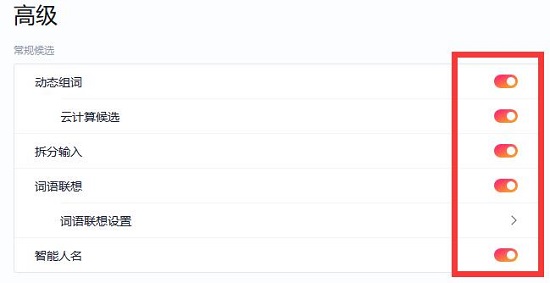 5、进入后,将“常规候选”中的开关都打开。