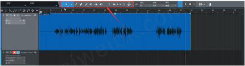 如图所示,裁剪I具位于Studio One_工具栏左数第三个位置。点击按钮选中裁剪I具,此时鼠标的作用相当于剪刀。