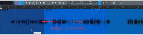 点击工具栏左侧的箭头按钮,标志变为蓝色,表示选中了鼠标工具。点击任意音频块,左右拖动鼠标,即可左右拖动音频块或者MIDI块。