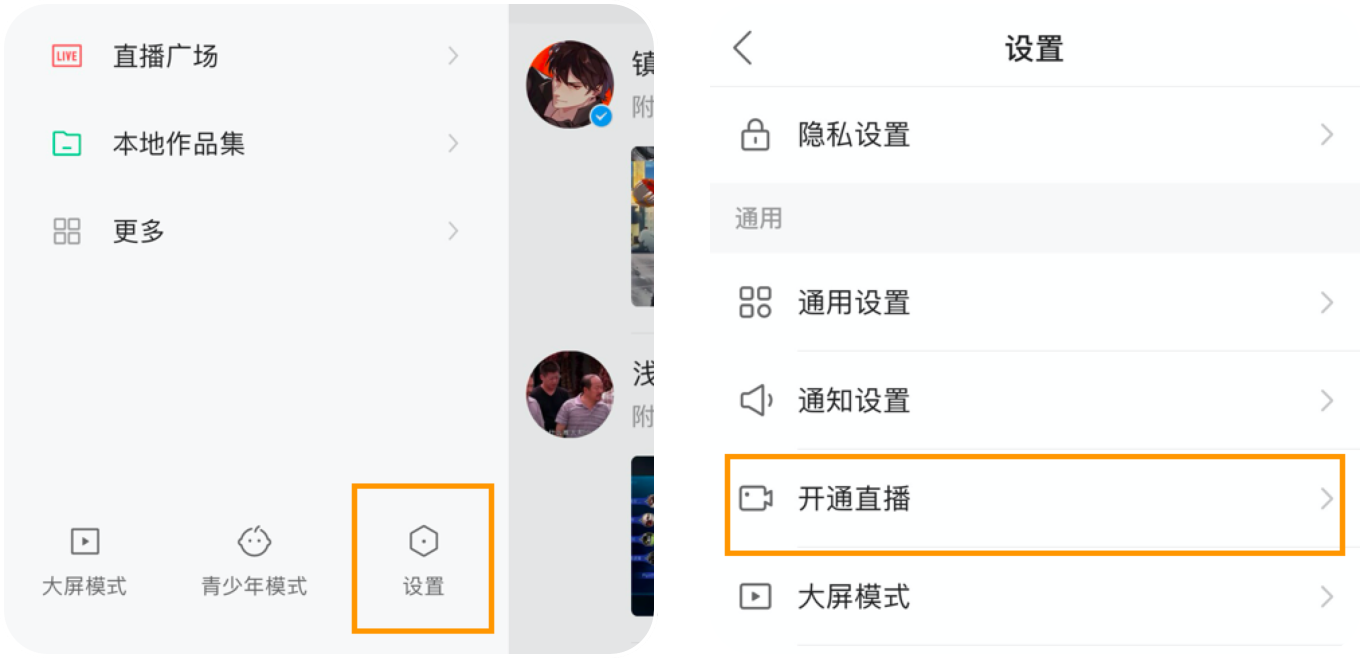 打开快手APP,在侧边栏找到设置-开通直播。