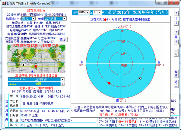 1、日梭万年历可查询每日的公历、农历、伊斯兰历日期,节气、节假日,年月日的天干地支、节气的交节时刻、月相和朔望时刻,日月食,每时每刻月亮可见亮面比例,儒略日序、每日距今日天数、任意两个日期之间相距天数,每日的十二时柱,三伏、九九、入梅出梅日期,每日星座,世界各地时间对照,全国2600多个城镇的经纬度及这些城镇每天的日出、日落时间和昼长(日出到日落的时间长度)、日上中天时间、天亮、天黑时间和光照时间长度,月出、月落和月上中天时间, 任意时刻对应的世界时、地球力学时、地方平太阳时和真太阳时。还能以实时、定时和动画三种模式显示4000年中任意时刻太阳和月亮在本地天空中的位置以及在地球上的直射位置。