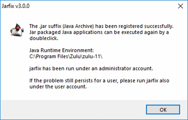 Jarfix是一个简单而有用的程序,可以免费下载和安装。该软件帮助重新捕获.jar与Java运行时环境的关联。它需要一个基于Windows的操作系统才能工作(95/98/ME/NT/2000/2003/2008/XP/Vista/7/8/10),但它不适用于Mac。如果您的机器上没有Java运行时环境,Jarfix会告诉您在哪里可以下载它。