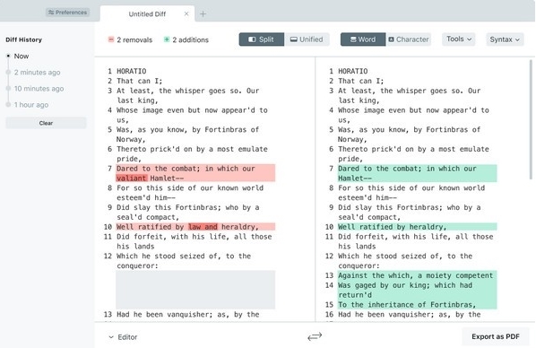 充分利用Diffchecker的所有功能,例如统一的差异视图,字符级差异等。