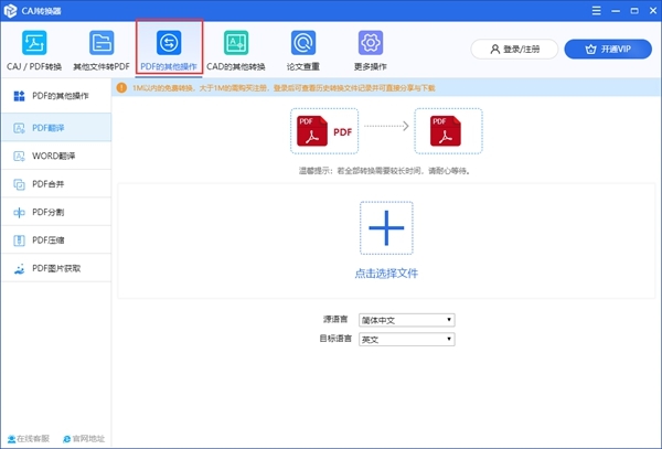 3、PDF的其他操作可以对PDF或Word文档进行处理。包含:PDF翻译、WORD翻译、PDF合并、PDF分割、PDF压缩、PDF图片获取;