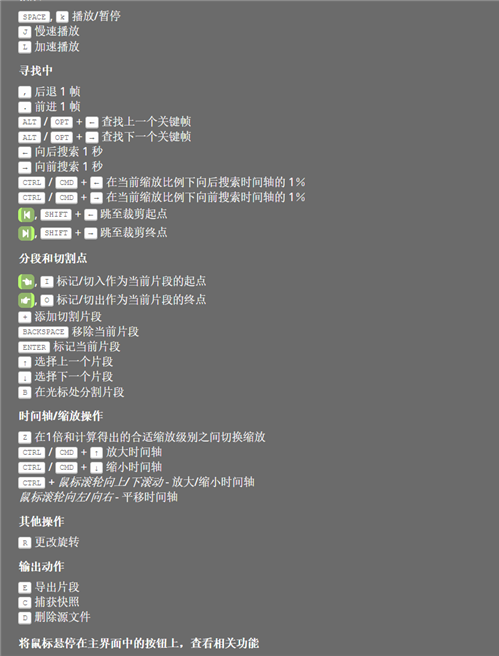 将鼠标放置到主界面右上角的问号后,还能看到常见问题和键盘和鼠标快捷键,当用鼠标大致粗选位置后,可以通过按秒甚至按帧的方式,来选择要裁剪的起始位置: