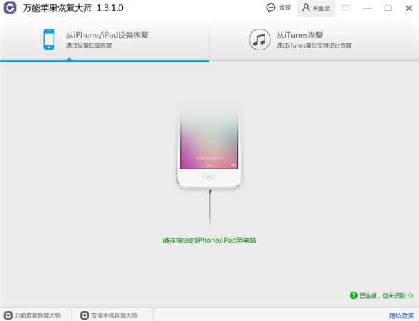万能苹果恢复大师是一款功能齐全、操作简单的苹果手机恢复软件。包括短信、通话记录、照片视频以及第三方APP等类型都可以恢复,只需把iPhone手机用苹果官配数据线连接到电脑上,然后运行苹果恢复软件,在这个界里,选择iPhone/iPad设备恢复功能, 具体实际需要恢复的文件类型,选择相应的类型,然后点击开始扫描就可以了。