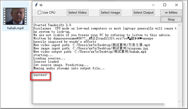 Yanderify 的界面非常简单,一个命令行窗口 + 一个毫无装饰的 GUI。我们所需要做的,就是选择一张图片素材和一段视频素材,然后设定输出路径。另外,Yanderify 对硬件有一些要求。Yanderify 支持 N 卡的 GPU 加速,但要求型号高于 GTX750,而且有 2G 以上的显存;而如果你用的是 A 卡的话,Yanderify 没法使用 GPU 加速,需要勾选 “Use CPU”的选项。