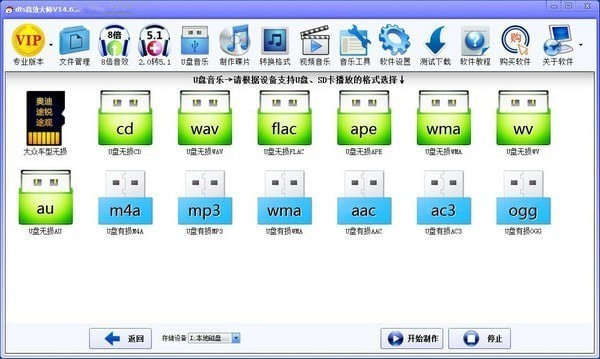 批量制作U盘、SD卡音乐;支持无损、有损、2.0、5.1环绕声;支持14种格式;