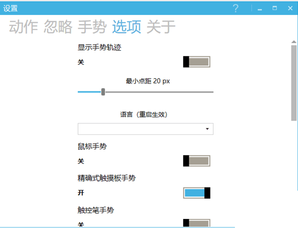 2、GestureSign 的主界面带着浓浓的 WP 风,以便触摸操作。而设置项非常简单,从左到右依次对应手势动作设置、已设手势预览、忽略程序名单、轨迹外观及其他设置这几个页面。