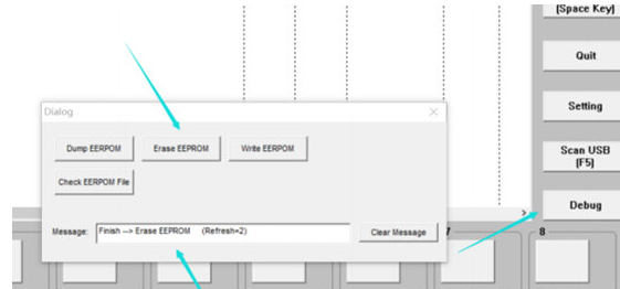 4、debug ----erase EEPROM------等 出现 Finish --》 Erase EEPROM (Refresh=2) 清掉原固件;