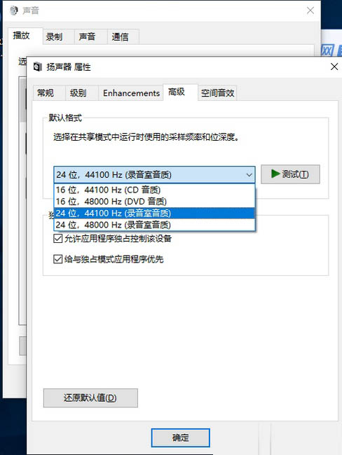 4、没有正常声音,只有噪音的情况,去把声卡48000改成44100播放就没杂音了。