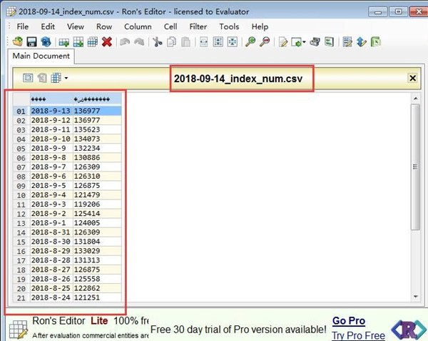 3、打开成功后,上方会显示CSV的文件名,中间会显示CSV文件里面的全部数据。