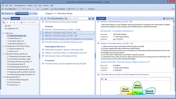 Citavi中的笔记分为摘要、目录、直接引用、间接引用、总结、图片或文件引用、评论、想法和分级等。用户可以根据分门别类、方便快捷地进行记录和检索。大部分类别支持从右侧的 PDF 预览列中快速建立。对 PDF 文件的标注、高亮等操作都可以在 Citavi 窗口中完成。使用 Citavi 可以不再依赖独立的 PDF 阅读器软件。
