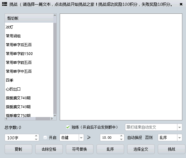 选择一篇文本,点击开始挑战,成功挑战奖励100积分,失败奖励10积分。