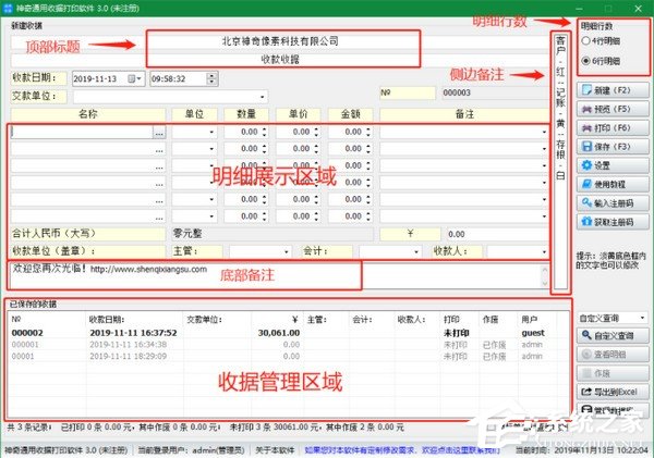 5、自由设置收据顶部标题1、顶部标题2、侧边备注、底部备注等。