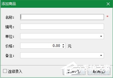 温馨提示:如需连续录入,可勾选左下角“连续录入”,勾选之后点击确定添加一条商品记录之后,本界面不会关闭。