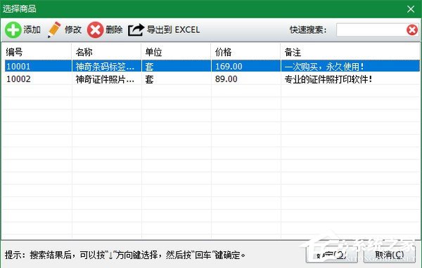 1、自定义商品列表,支持编号、名称、单位、价格、备注等商品信息的自由录入,不限制数量,提供快速搜索功能。