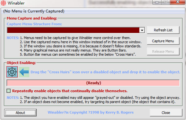如果您使用的应用程序具有无法访问的菜单,那么如果Winabler支持该应用程序,则可以免费该菜单。当您打开Winabler程序时,它会显示一个窗口,其中包含其他窗口及其菜单的列表。您可以简单地选择要启用的菜单。这将捕获菜单。