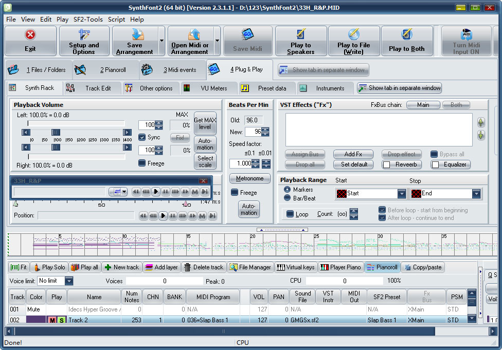 SynthFont2是一个免费工具,用于播放midi文件,使用SoundFonts(“SF2”文件)或其他声音文件,如DLS,GIGA,404,GUS。使用SynthFont(1或2),您不需要任何特定的声卡。事实上,如果你只想渲染音频文件(“.WAV”文件),你甚至不需要声卡。SynthFont的一个主要特点是,可以非常轻松地将不同的SoundFonts分配给不同的MIDI通道以及您选择的任何SoundFont Preset到MIDI轨道中的特定MIDI程序。这些设置等等可以存储在Arrangement文件中。(注意轨道列表上方工具栏中的按钮)。
