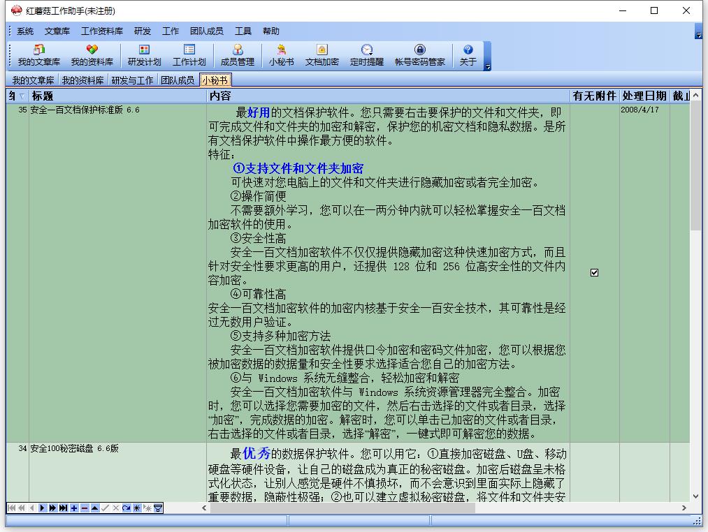 红蘑菇工作助手是一款用来管理工作的软件,操作方便,还特别为科研人员和技术人员定制了论文库和资料库,方便科研人员和技术人员工作,区别其他文档管理系统,将所有文档资料存到数据库中,避免传统文件夹遭遇病毒或人为破坏,并且绿色便携,无需安装,将其解压即可运行。可以很方便的放在U盘和移动硬盘,在哪儿都能使用。