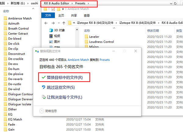 7、接着对软件进行汉化,打开解压之后的汉化文件夹,在打开“RX 8 Audio Editor”文件夹,找到presents文件夹,再将最里面的44个文件夹复制到软件安装的【RX 8 Audio EditorPresets】路径下,替换原来的文件,如下图;