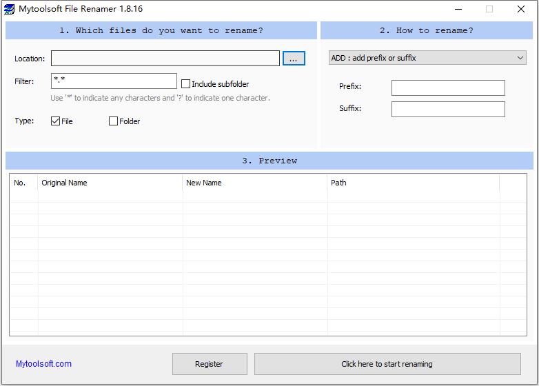 Mytoolsoft File Renamer是一款专业可靠的批量重命名软件,可以多个文件进行重命名,提供多种策略,如按顺序号重命名、替换部分文件名等,可以轻松预览所有文件,无论您是否改变了文件状态或改变了策略。