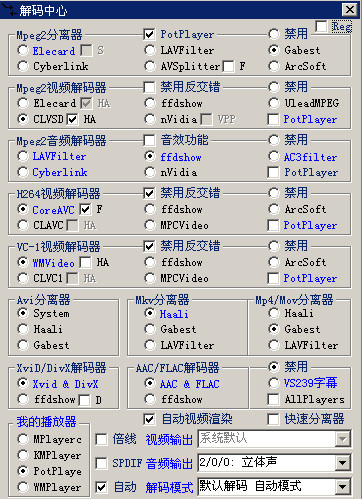 g、 “解码中心”已可通过鼠标右键,完成解码器设置(常用音频、CoreAVC、WMV9、VonSub字幕、ffdshow、Haali、Real、Quicktime)、不同版本分离器/解码器的切换(Elecard、CoreAVC、CLAVC、Haali)、播放器默认设置恢复以及解码模式保存/载入等功能。
