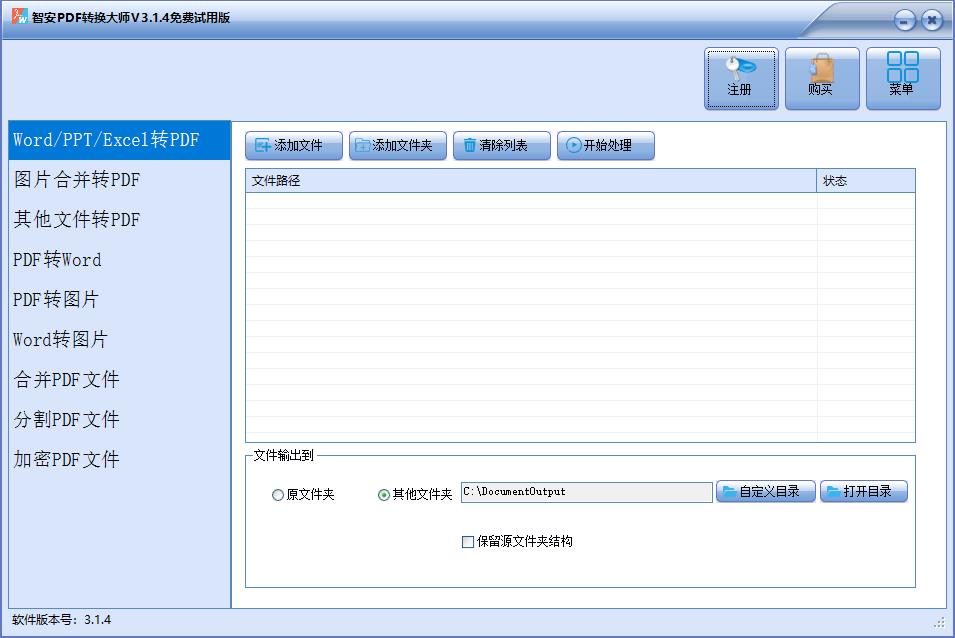 智安PDF转换大师是一款界面简单,设计人性化,傻瓜式操作,转换效果好的转换器。就算没有学过电脑基础,也能轻松上手,实现文件高质量的转换效果。