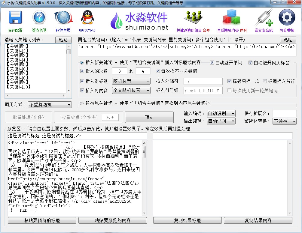 水淼关键词插入助手可实现无缝插入或打乱,即原空行、标点符号等保持不变,变得只是文字。因此打乱的句子具有相对可读性,而插入关键词可智能避免割断网页标签和英文单词。