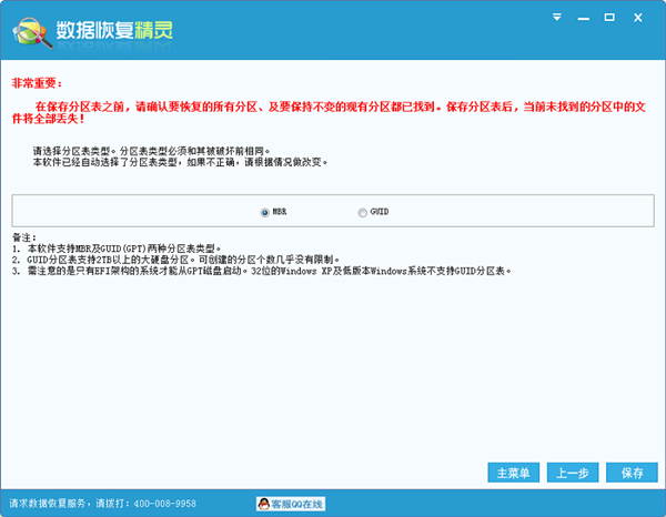 数据恢复精灵软件支持将分区表保存为传统的MBR格式(目前小于2TB的硬盘绝大多数使用此格式),及较新的GUID格式。保存分区表之前,软件会根据磁盘及分区情况自动选择一种分区表格式。如果自动选择的分区表格式不正确,请您自行选择与原来的分区表格式相同的格式。