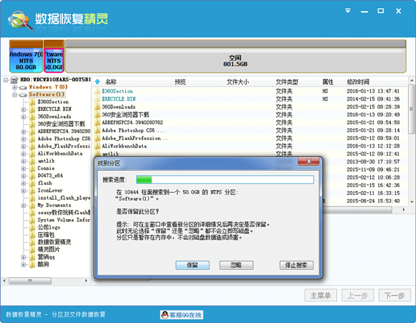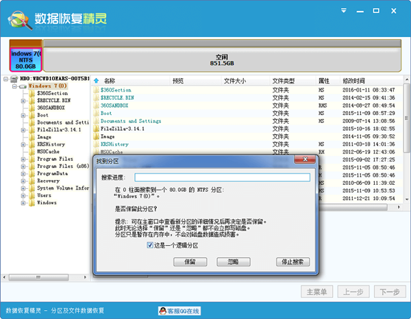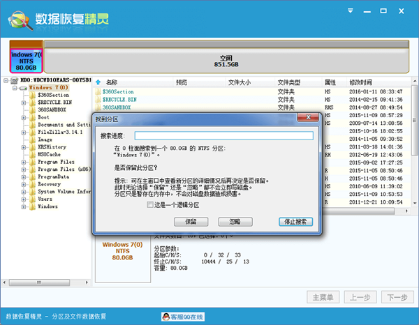 如果这个分区正是您要恢复或保留的分区,请点击弹出对话框中的“保留”按钮,分区将暂时保存在内存中,不会立即写盘。如果这个分区不是您要恢复的分区,请点击“忽略”按钮跳过这个分区。目前的所有操作结果均保存在内存中,还没有写入到磁盘中,搜索过程是只读的。
