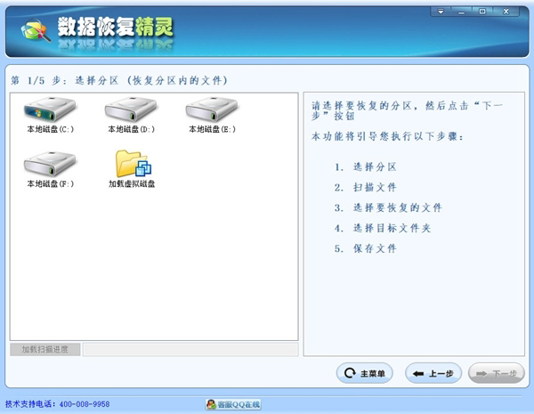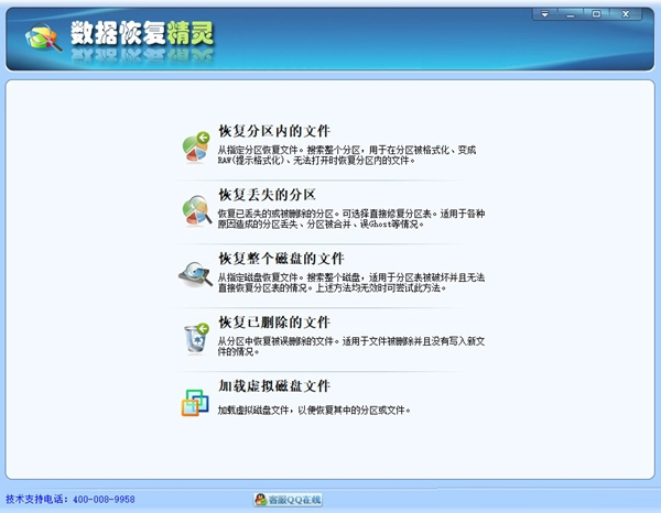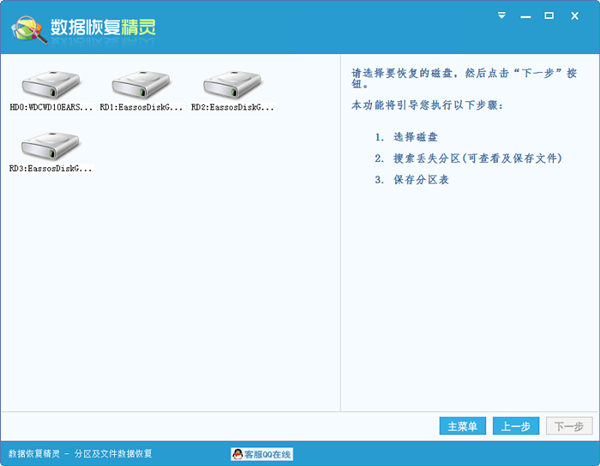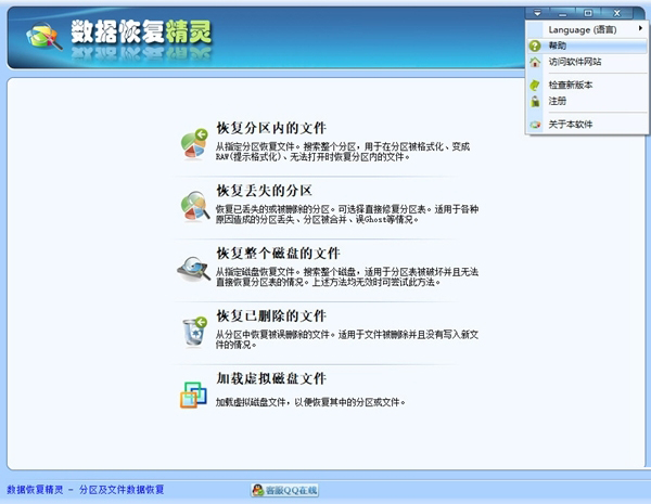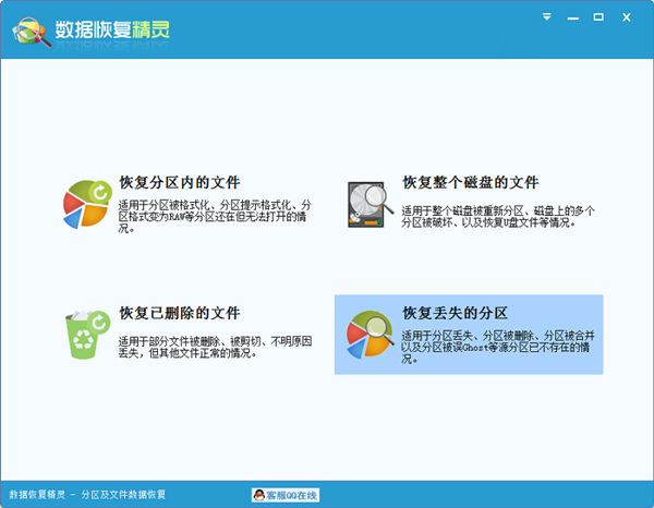 要开始恢复丢失的分区,请点击数据恢复精灵软件主界面上的“恢复丢失的分区”按钮。如下图: