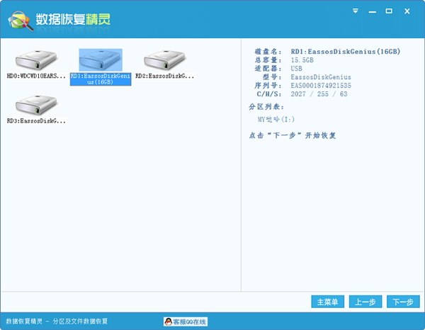 请先选择要恢复分区的磁盘。所选磁盘的有关信息(包括容量、型号、当前分区状况等)将显示在右边的窗口中。如下图: