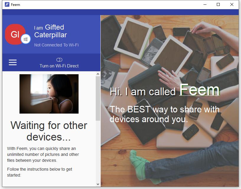 Feem是一款轻量级软件应用程序,专门用于帮助您与本地或WiFi网络中的人聊天,并共享文件,无论是歌曲,视频还是文档。
