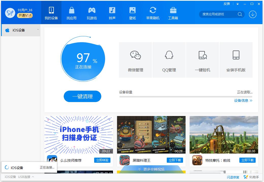 将ipad、iphone等设备用数据线连接电脑,然后打开91手机助手。