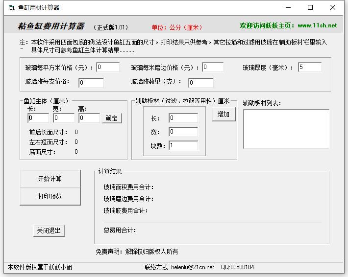 鱼缸用材计算器是款适用于制作鱼缸行业所打造的鱼缸用材计算工具,能够提供非常完善的鱼缸制作需要的用料和费用,让用户可以清楚知道做一个鱼缸需要多少物料和成本,使用也十分便捷,只需输入相应的数据点击“开始”计算即可,对于计算的结果还可以直接进行打印。